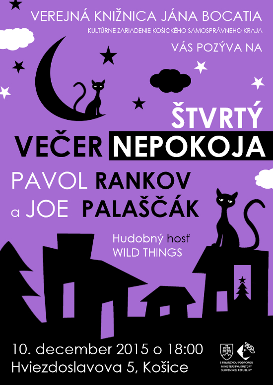 Cyklus literárno-hudobných podujatí Štyri večery nepokoja, ktoré Verejná knižnica Jána Bocatia v Košiciach (VKJB) organizovala túto jeseň, vyvrcholí 10. decembra 2015 o 18:00 hod. posledným, štvrtým večerom. V centrálnej požičovni knižnice (Hviezdoslavova 5) opäť privítame dvoch zaujímavých slovenských autorov. Pozvanie tentoraz prijali známy prozaik Pavol Rankov a košický básnik Joe Palaščák.